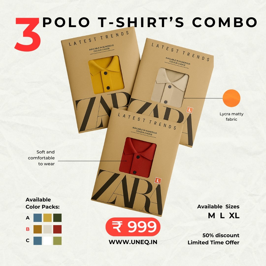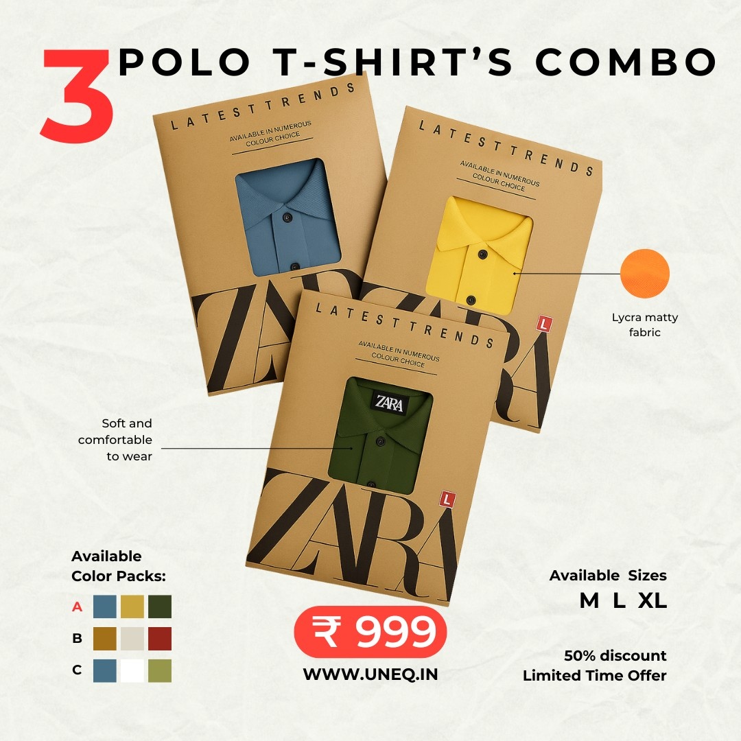 Upgrade your wardrobe with this 3 Polo T-Shirts Combo crafted from premium cotton lycra matty fabric for unbeatable comfort and style. Each pack (A, B, C) comes with 3 attractive colors in each pack, giving you versatile options for everyday wear.